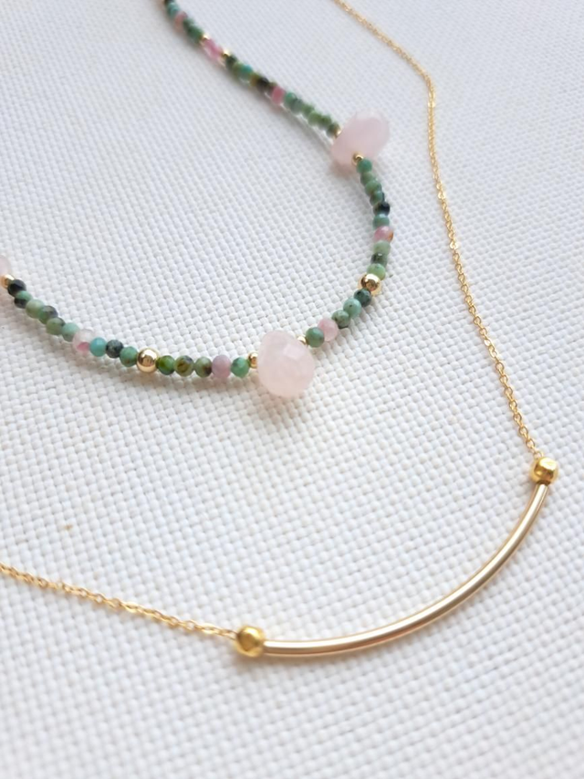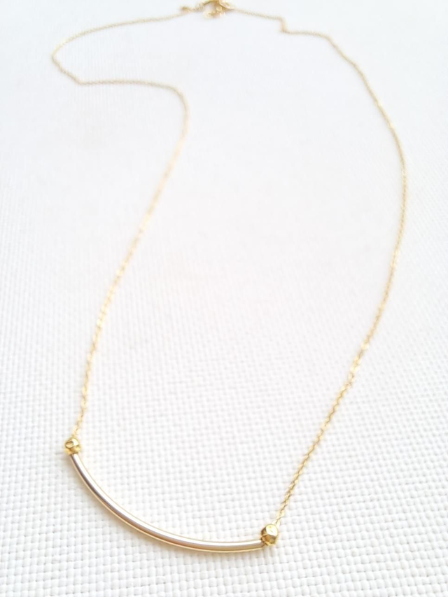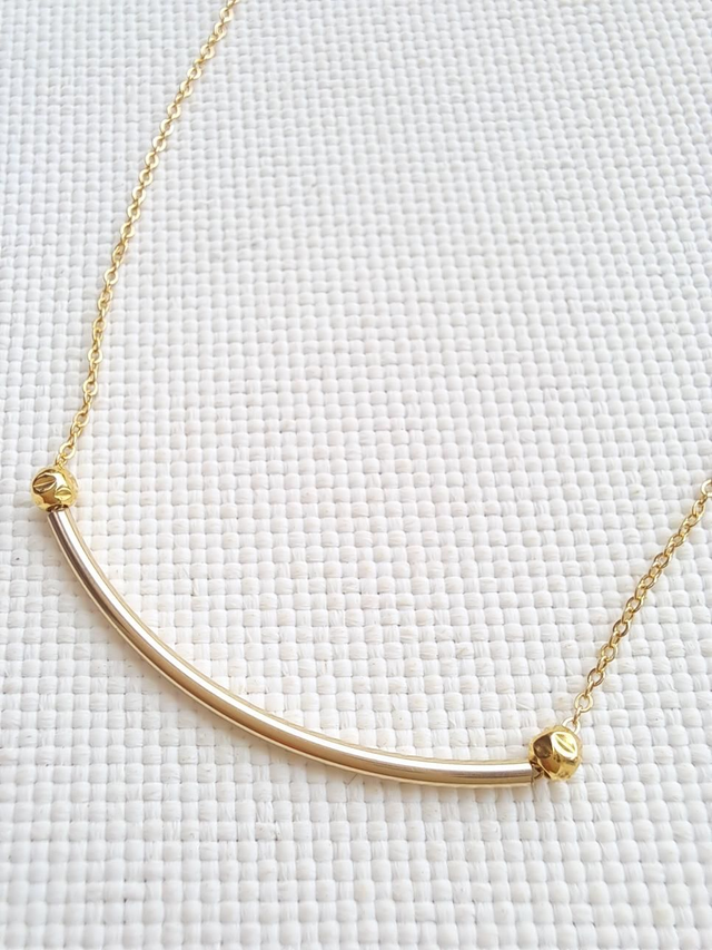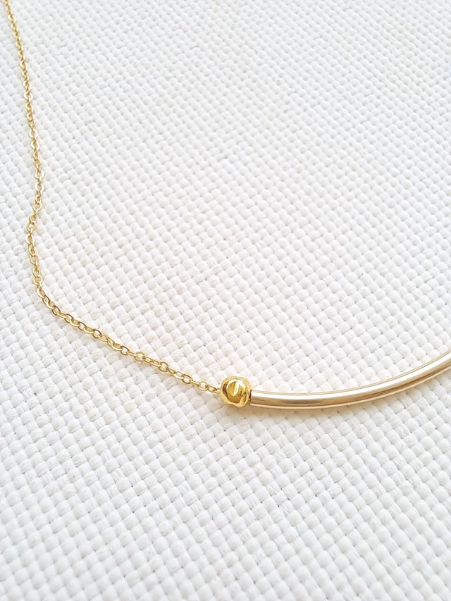 Le Collier long Amaïa est un bijou fin et délicat qui allie élégance et modernité. Conçu en or laminé 14 carats, il se distingue par son élément central : un tube incurvé en or laminé, flanqué de deux perles froissées de 3 mm de chaque côté, pour un effet subtil et raffiné.