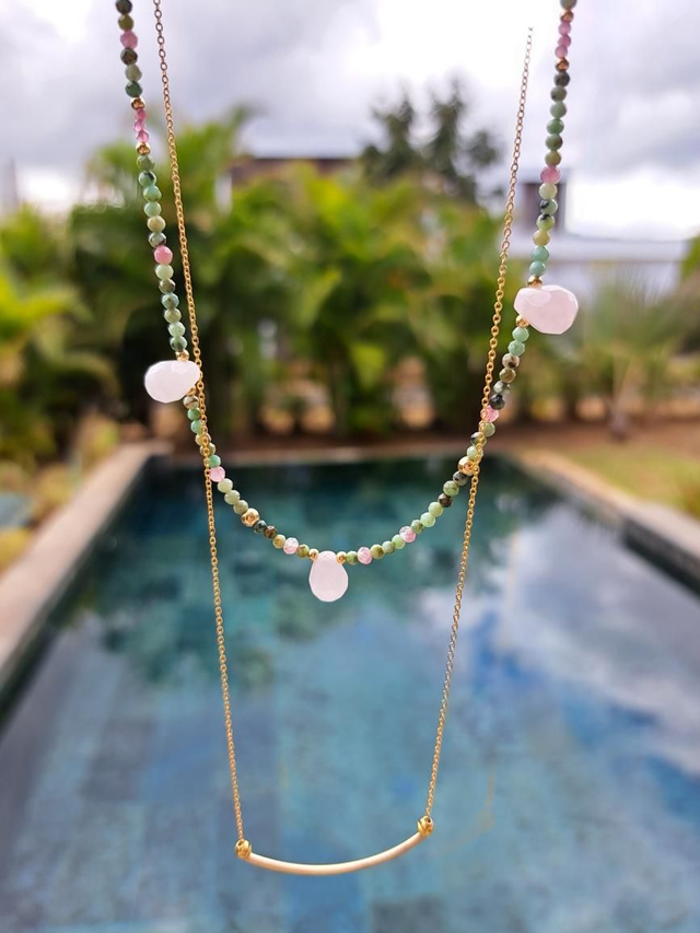 Le Collier Amaïa se porte seul pour une touche de couleur délicate ou associé à d’autres bijoux de la collection, il symbolise l’élégance, la douceur et l’énergie positive.