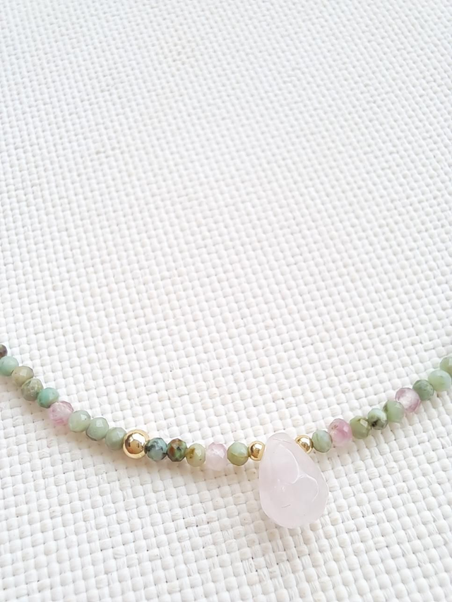 Collier Amaïa – Turquoise Africaine, Tourmaline Rose & Quartz Rose en Or Laminé 14k