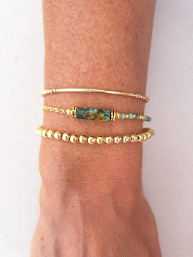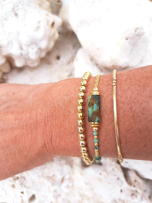Un bijou raffiné composé de perles naturelles en turquoise africaine et de finitions en or laminé 14k.